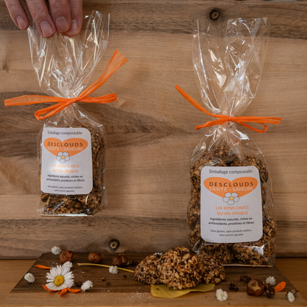 Ingrédients: Noisettes*, chocolat noir Suisse d’exception* ( fèves de cacao écalées*- Ghana-, sucre de canne*, beurre de cacao*, vanille* de Madagascar, cacao: 70% minimum ), blancs d’ oeufs enrichis en oméga 3*