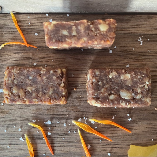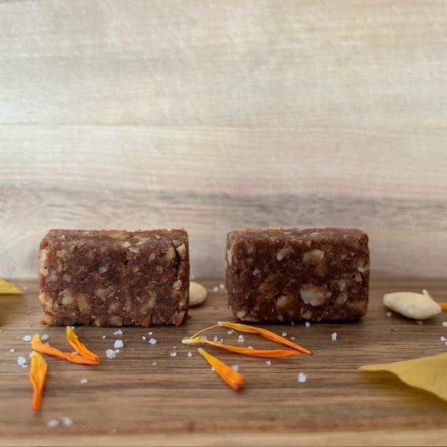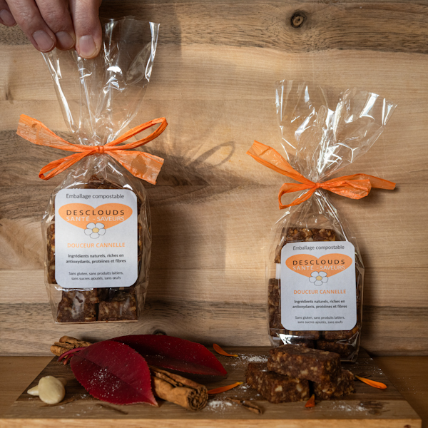 Ingrédients: Amandes mondées*, farine de sorgho*, dattes*, huile d’olive extra vierge*, fécule de tapioca*,  cannelle de Ceylan*, poudre de vanille de Madagascar*,  sel iodé non fluoré